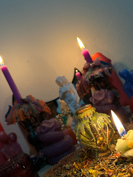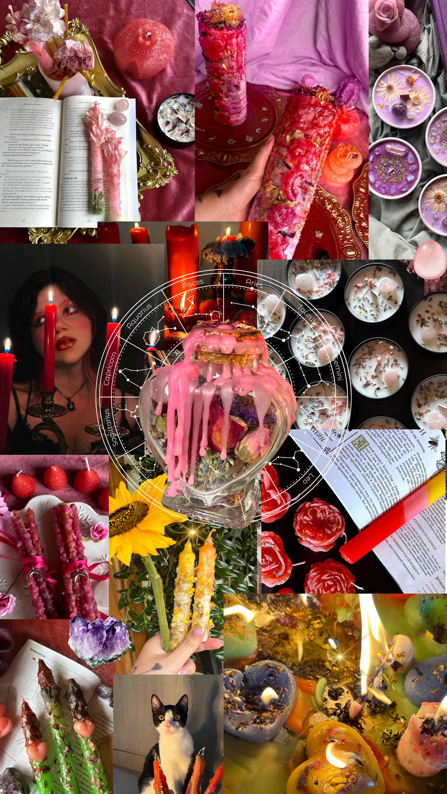 Velas IntencionadasLas velas se realizan de forma manual y con distintas intenciones brujiles. La idea es conseguir cumplir tus deseos y sueños mas profundos, ya sea aumentar tus ganancias o conocer a alguien especial.
