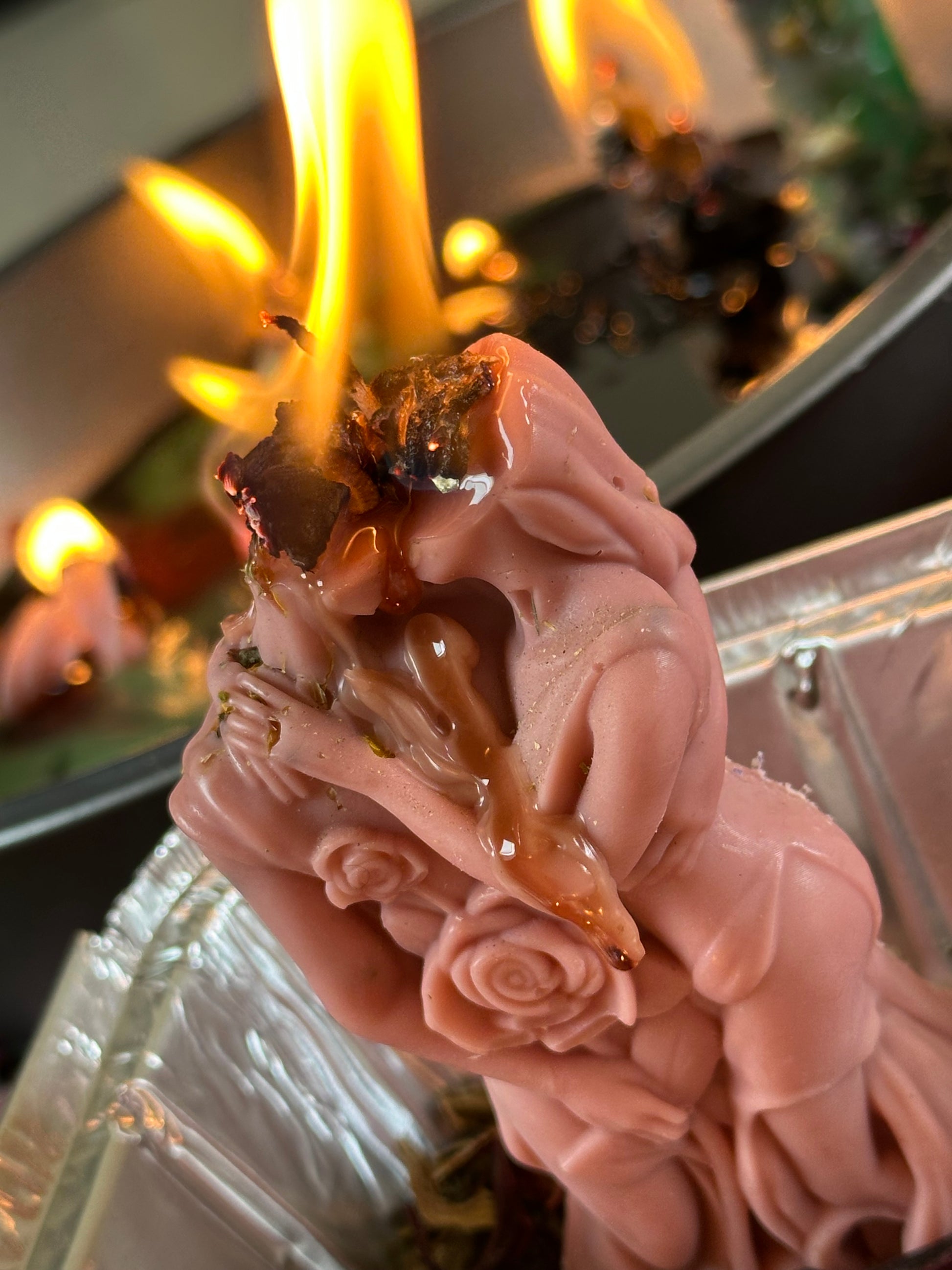 • 1 vela intencionada artesanal, elaborada con hierbas mágicas como flor de Jamaica (atracción emocional), manzanilla (armonía), y romero (claridad y conexión espiritual).