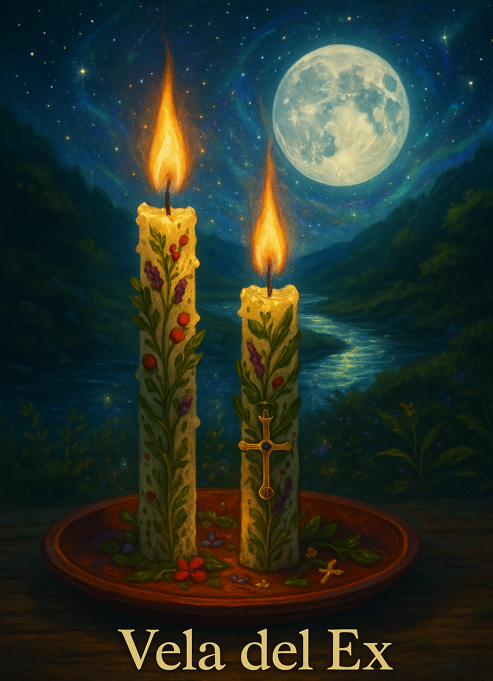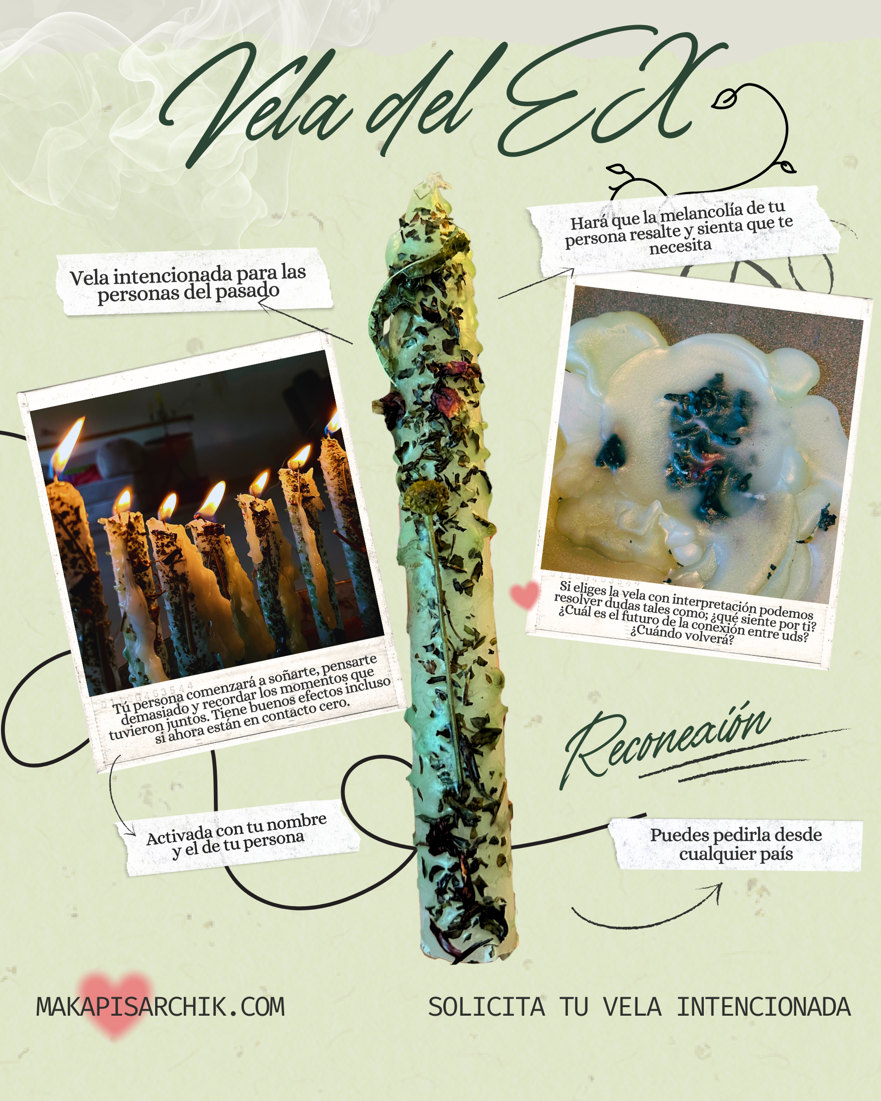 Es una vela artesanal y hecha a mano que contiene Canela, Miel, Jamaica, Abrecaminos. Hace que las energías de esa persona del pasado y tú puedan conectarse para que comience a pensar en ti y desee estar contigo, contactarte o escribirte.